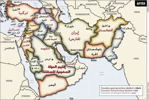 لقد قسمت المنطقة إلى 19 دولة، كلها تتكون من خليط من الأقليات والطوائف المختلفة، والتي تعادي كل منها الأخرى، وعليه فإن كل دولة عربية إسلامية مُعَرَّضَة اليوم لخطر التفتت العرقي والاجتماعي في الداخل إلى حد الحرب الداخلية، كما هو الحال في بعض هذه الدول.