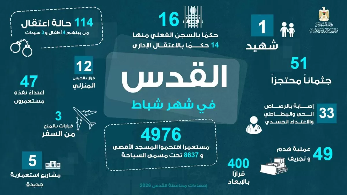 اعلام فتح / من وفا– رصدت محافظة القدس خلال شهر شباط 2026 تصعيدا واسعا في جرائم الاحتلال الإسرائيلي في المدينة، تمثل في ارتقاء شهيد، واقتحام 4976 مستعمرا للمسجد الأقصى المبارك، وتسجيل 114 حالة اعتقال، وأكثر من 400 قرار إبعاد، إضافة إلى 49 عملية هدم وتجريف، و143 إخطارا بالهدم والإخلاء والاستيلاء، ضمن سياسة ممنهجة تستهدف فرض وقائع استعمارية جديدة وتغيير الطابع الديمغرافي والجغرافي للمدينة.