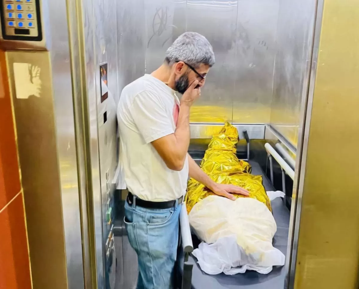 واقفا، فوق جثمان ابنته في مستشفى رفيديا في نابلس، يطيل أمجد بكر النظر فيه، واضعا يده على وجهه.