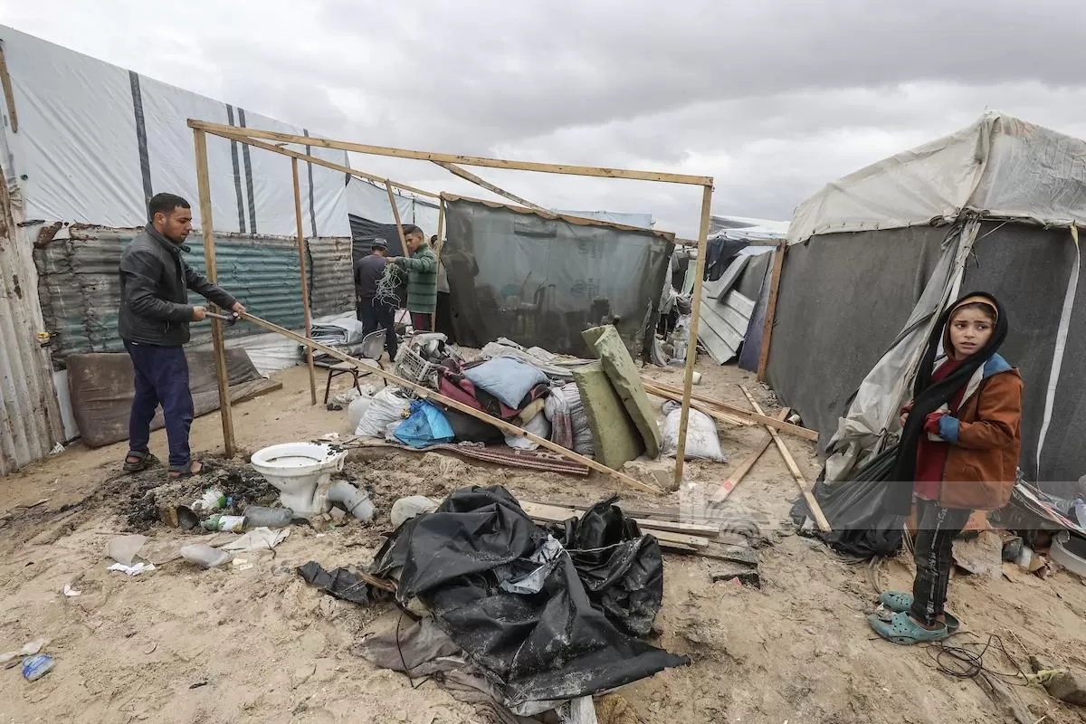 وبين المدهون أنه لم ينم طول الليل هو وعائلته بسبب الأمطار التي كانت تتساقط وتتسرب إلى داخل الخيمة، مشددا على أن أمل النازحين هو الحصول على أي شيء يغطون به خيمهم من المطر حتى ولو كان قماشا.