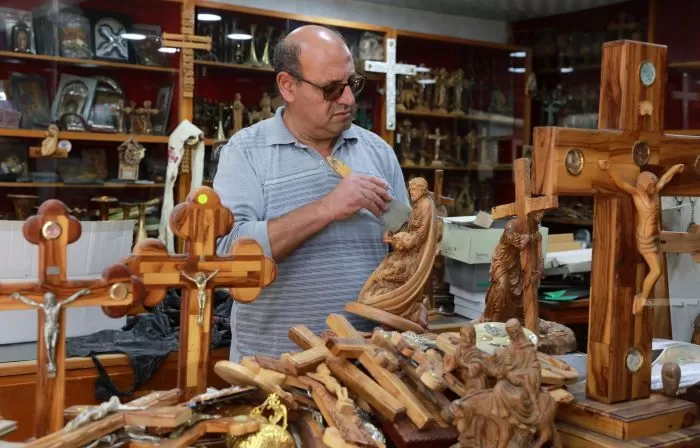 على مدخل شارع مغارة الحليب، المحاذي لكنيسة المهد، انشغل المواطن جون بعبول بفض الغبار عن بضاعته المكدسة في محله لبيع التحف الشرقية.