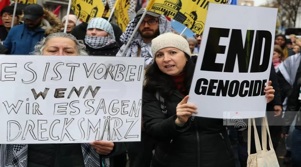 ورفع المحتجون لافتات كتب عليها عبارات من قبيل "أوقفوا قصف غزة"، و"رئيس الوزراء الإسرائيلي بنيامين نتنياهو قاتل"، و"فلسطين حرة".