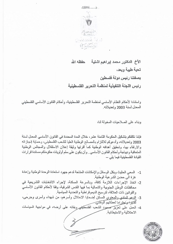 إنني بِردي على كتاب التكليف، الصادر لي منكم، لأكون رئيساً للوزراء، أعاهد الله وأعاهد سيادتكم، وأعاهد إخواني في حركة فتح، وشعبنا البطل الصابر الصامد، وأعاهد آلاف الأسرى في عتمة السجون، ودم الشهداء الذي أنبت حنَون فلسطين، وأوجاع الجرحى، وأعاهد أبناء المخيمات في الوطن والمنافي، وأبناء شعبنا في الشتات، أن أعمل بكل جهد وإخلاص لرفعة فلسطين بقيادتكم، فلسطين الوطن، فلسطين الشعب، فلسطين القضية، لتصبح بإذن الله حرة عامرة، ذات سيادة، ديمقراطية، ومفتوحة لأبنائها وأولادهم وأحفادهم.