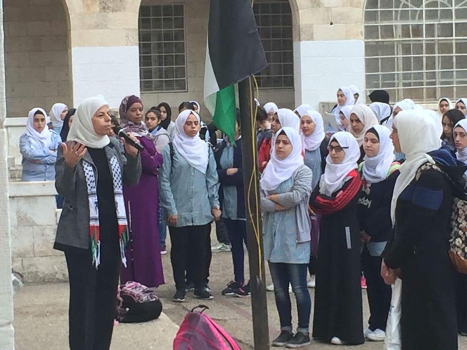 نابلس-اعلام فتح- شاركت عضو اللجنة المركزية لحركة فتح دلال سلامة اليوم طلاب مدرسة العائشية الثانوية للبنات في نابلس، وقفة احتجاجية لإحياء الذكرى المئوية لوعد بلفور المشؤوم.