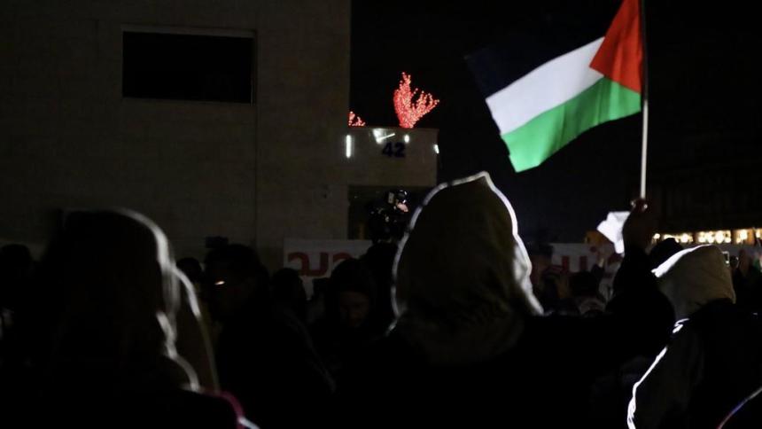 وهتف المحتجون خلال الوقفة بعبارات منددة بالاحتلال الإسرائيلي وانحياز القيادة الأميركية للإسرائيليين على حساب الحقوق المشروعة للشعب الفلسطيني بإقامة دولتهم المستقلة على ترابهم الوطني وعاصمتها القدس الشريف.
